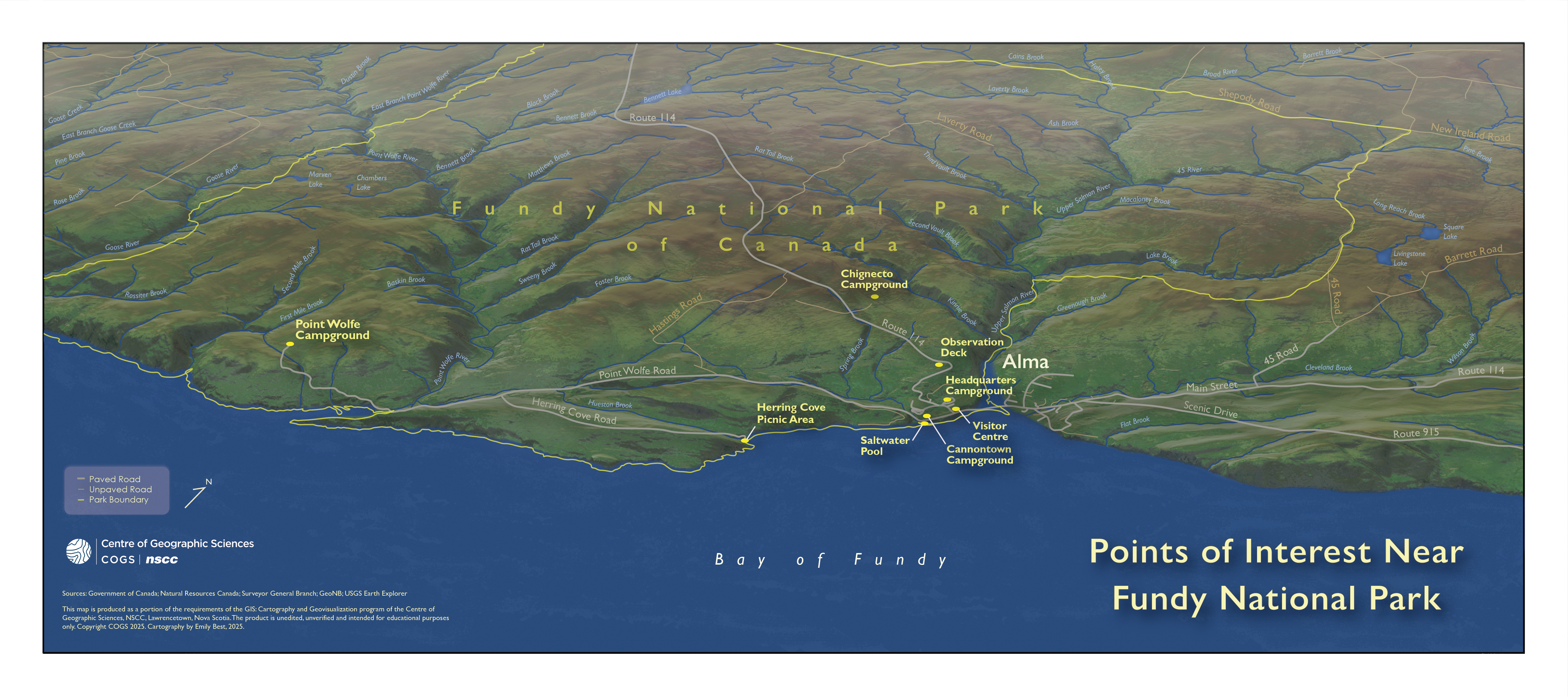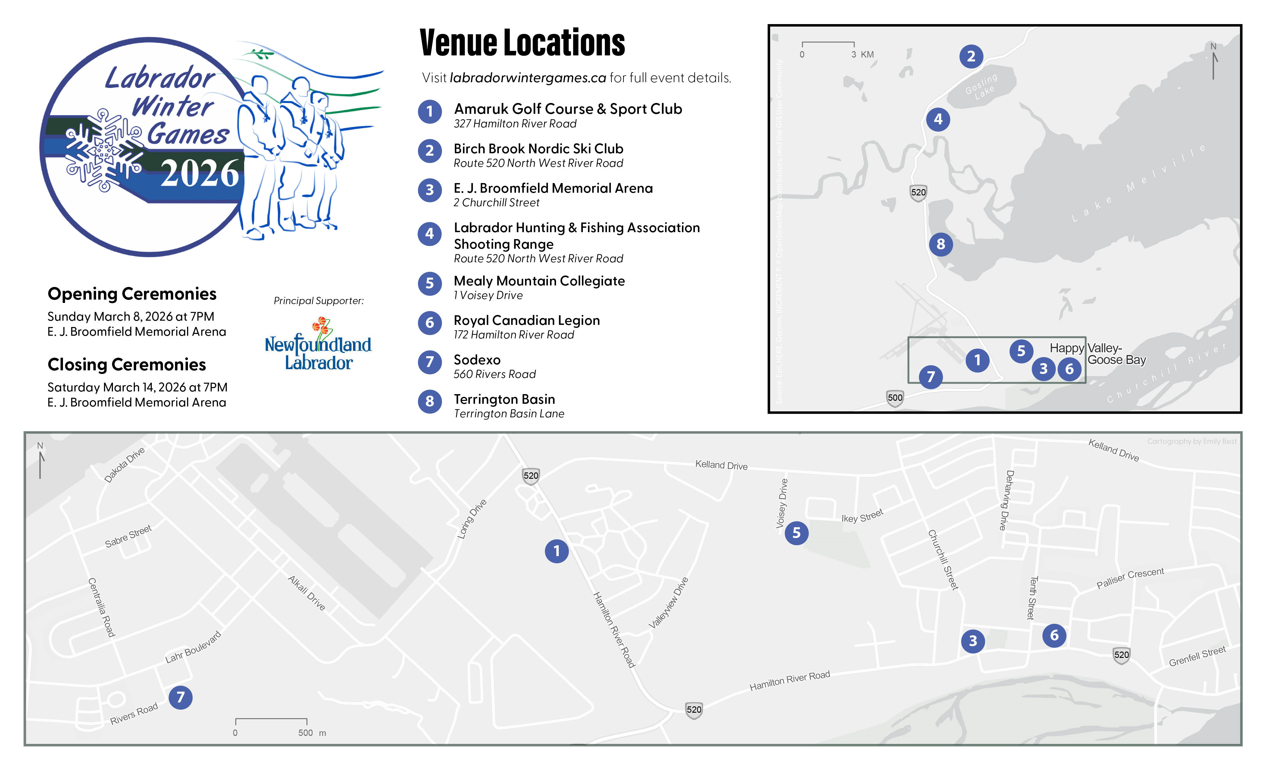 3D Terrain map of Fundy National Park, radial flow map of AirNA Routes, and map of Labrador Winter Games venue locations.